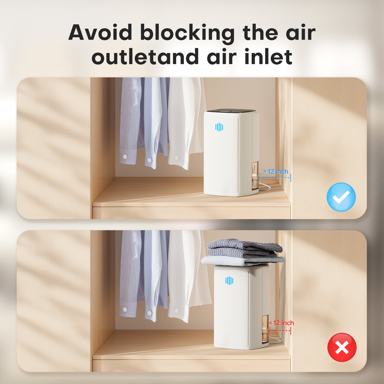 - Important tips for use: Please keep the air inlet on the top and the back outlet of the dehumidifier without any obstacles.